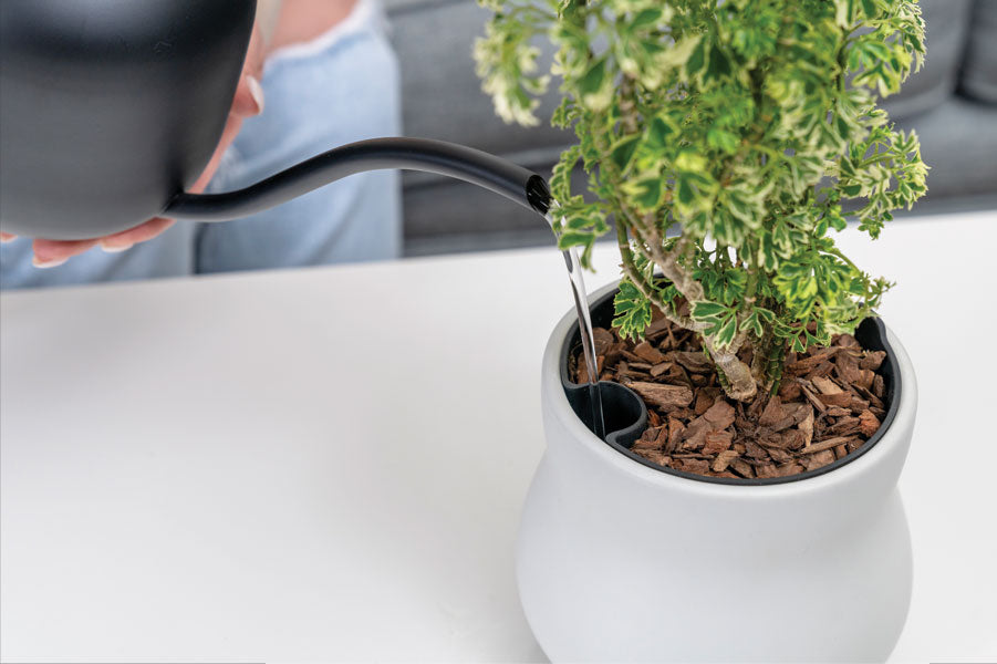 Pour water into the side funnel of the liner, letting the roots drink what they need. After one hour, remove the liner and pour out any excess water.
